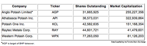 explorers such as Potash One Inc. (KCL- Vancouver), Athabasca Potash Inc. (API-